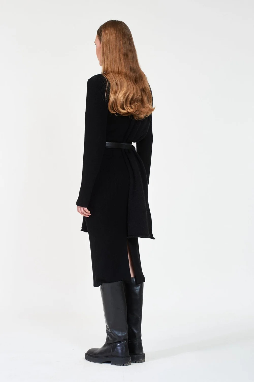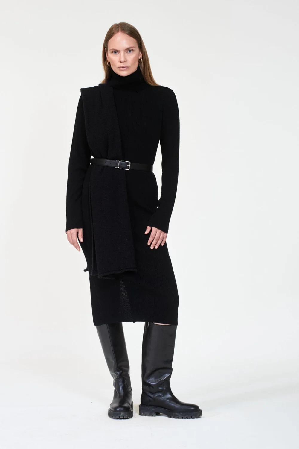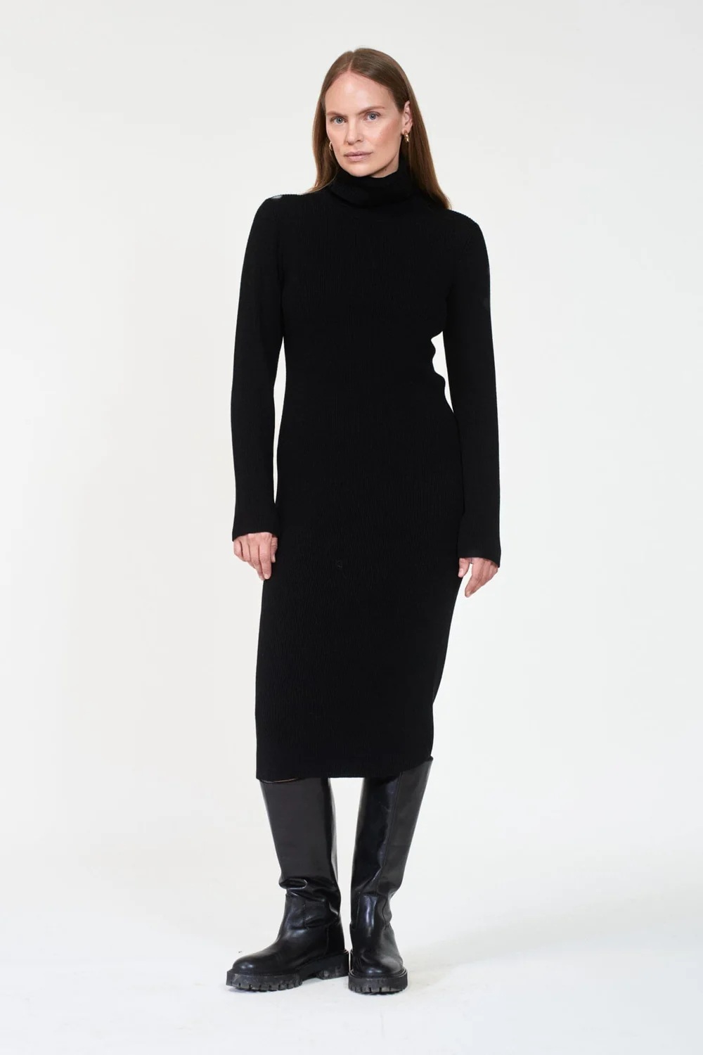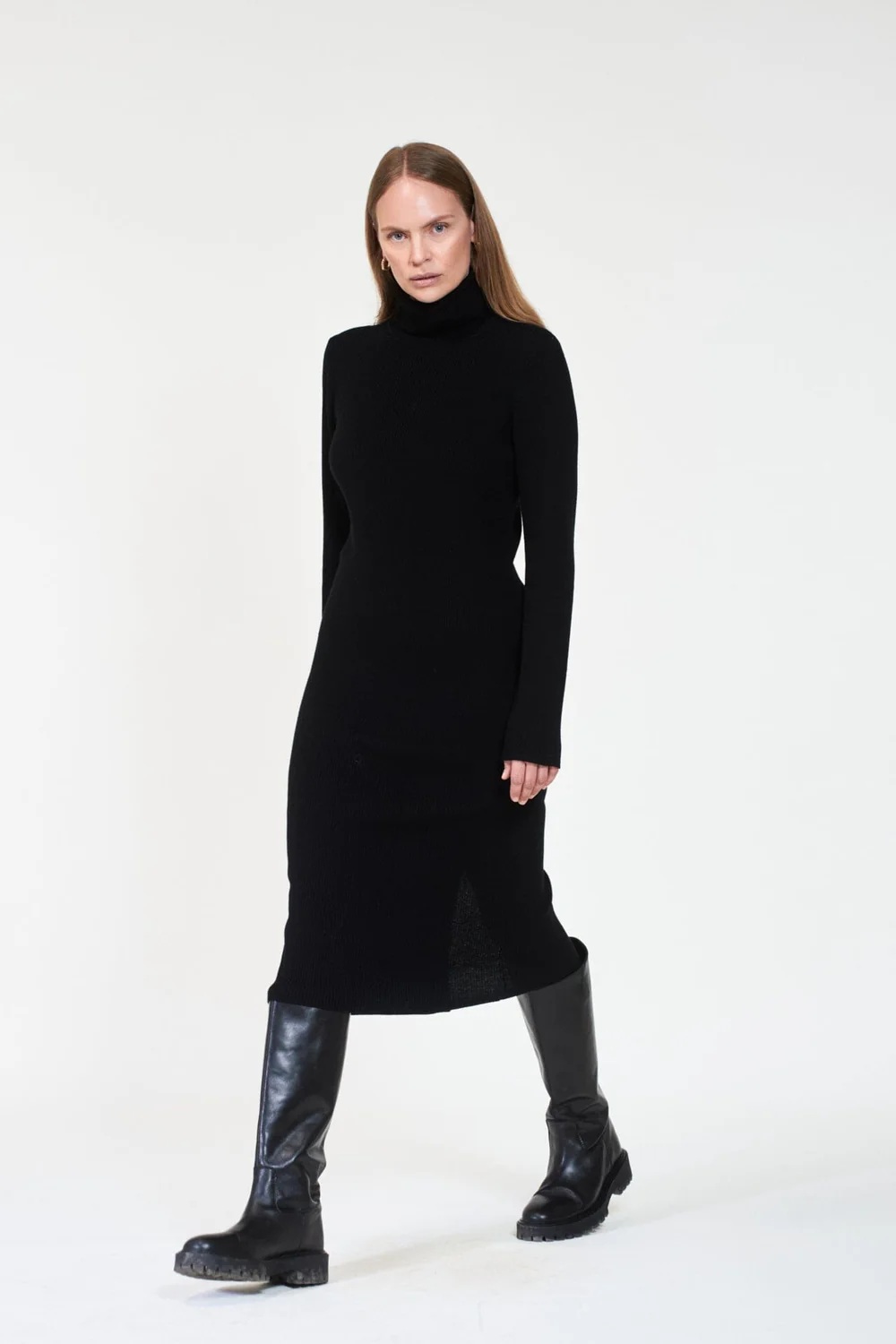 Charlize er en ribbestrikket midikjole i myk merinoull.