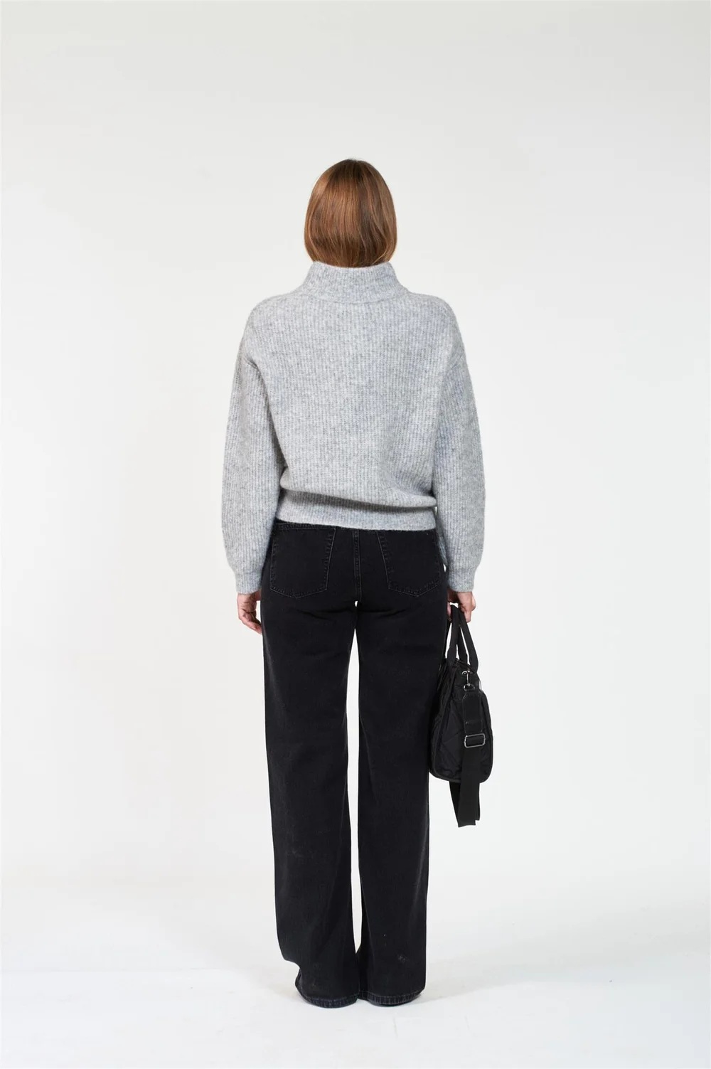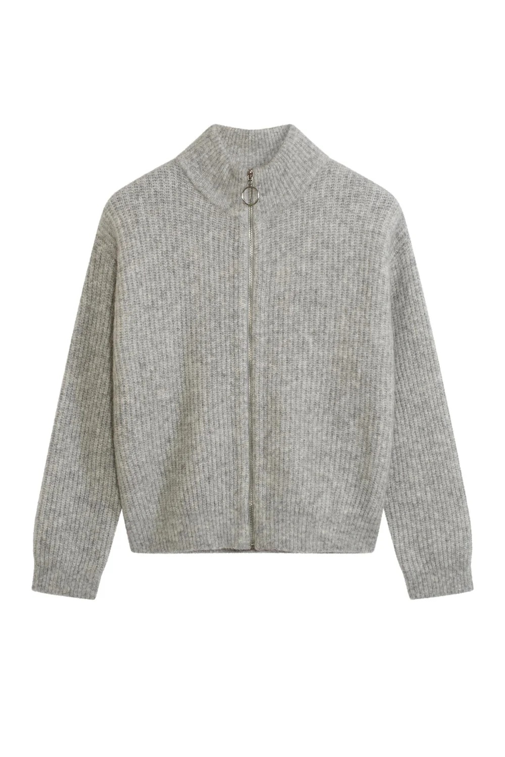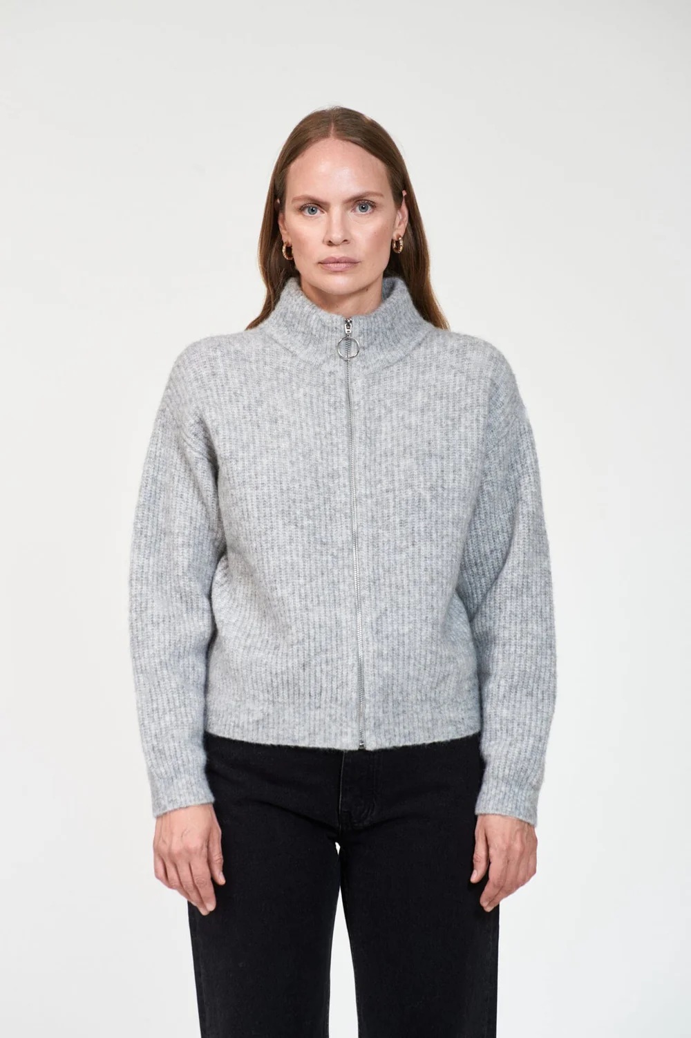 Ribbestrikket cardigan i en kompakt alpakka -ull blanding.