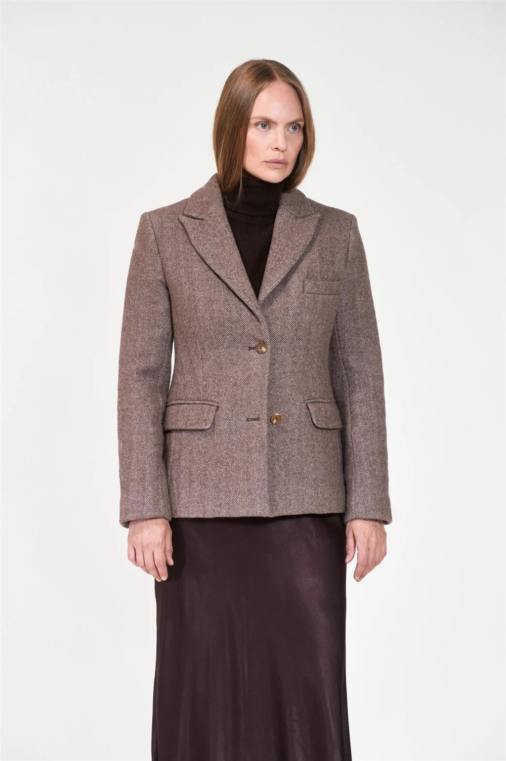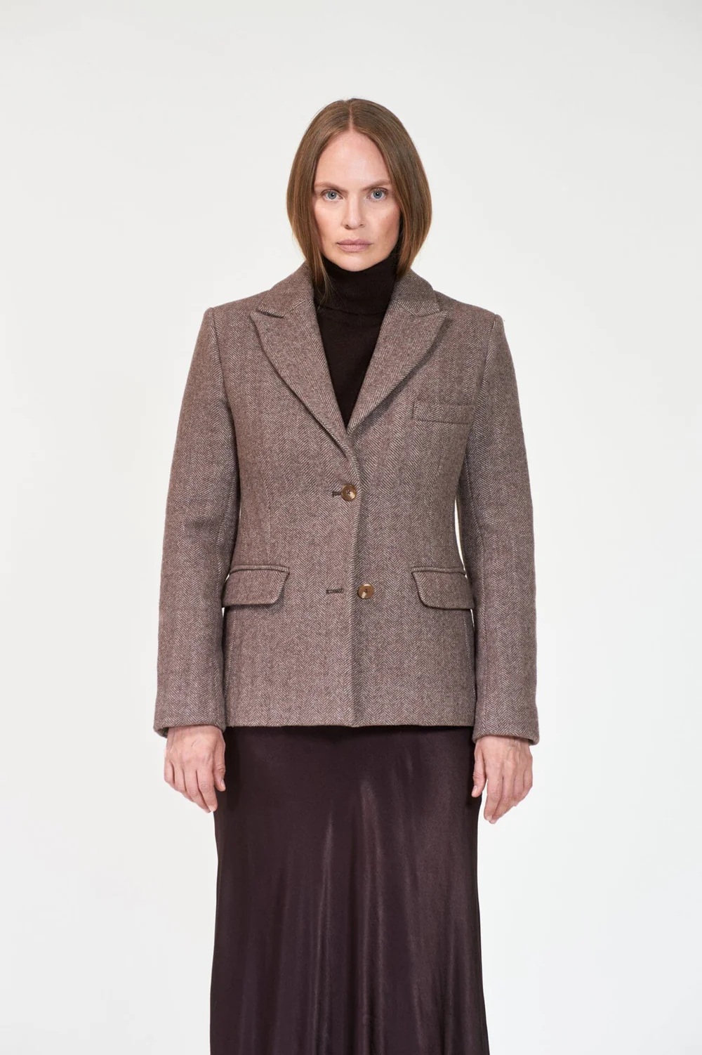 Modellen er designet med bredt jakkeslag, to frontlommer og splitt i ryggen.
