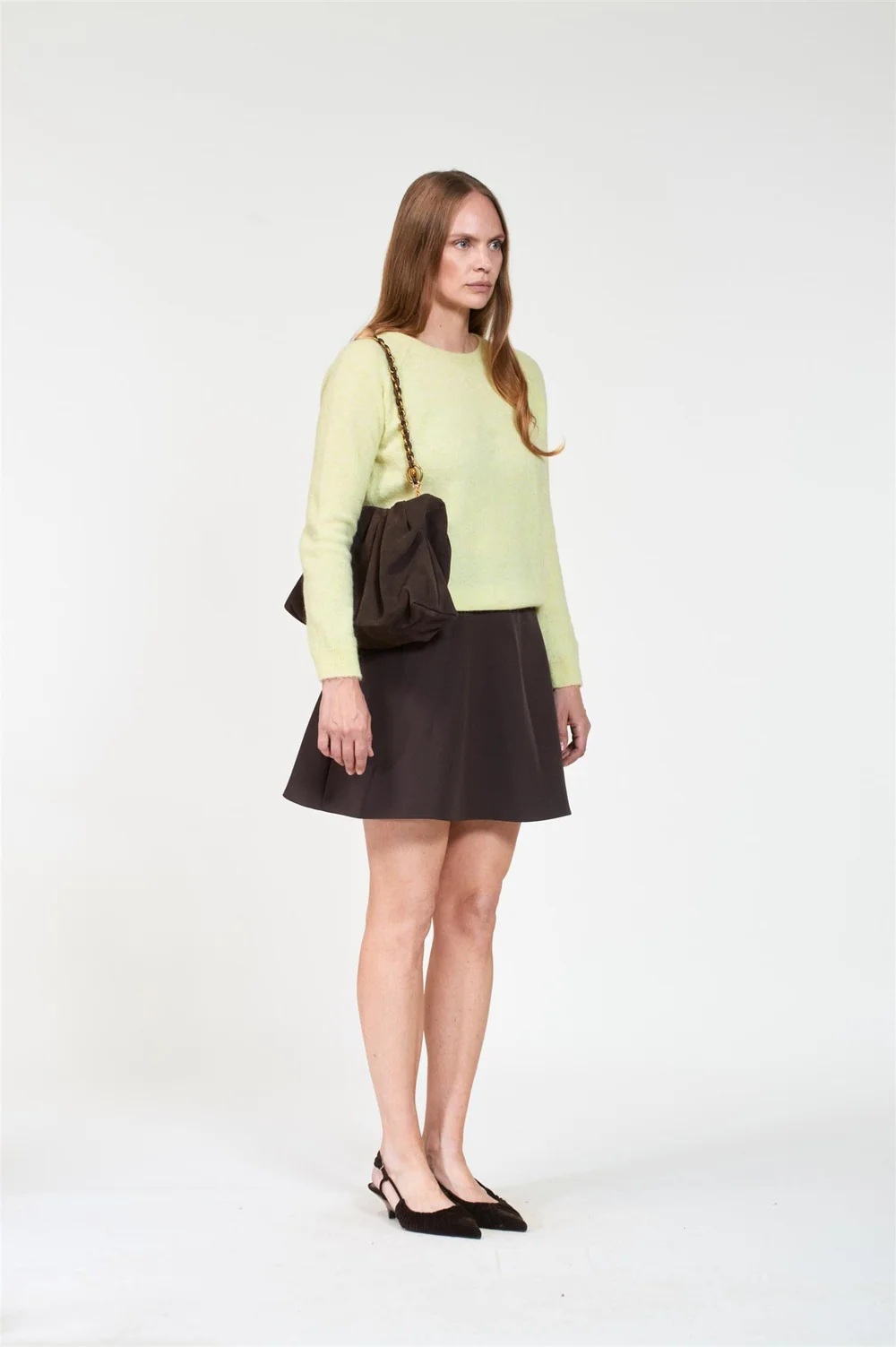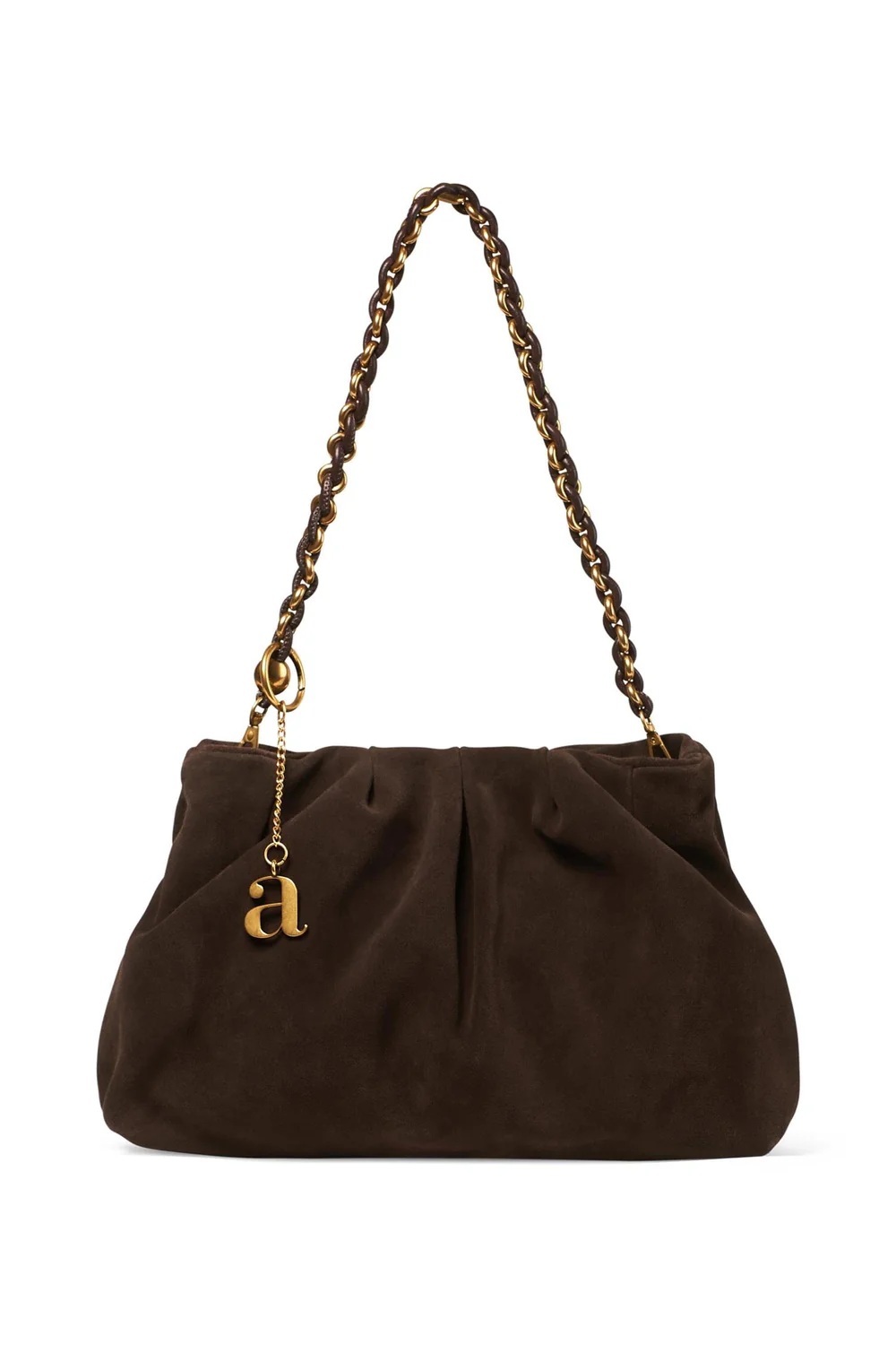 En lett og myk veske med rynket silhuett, laget i delikat semsket skinn.