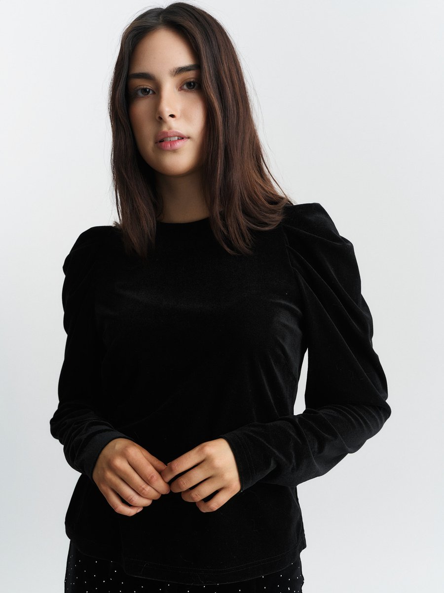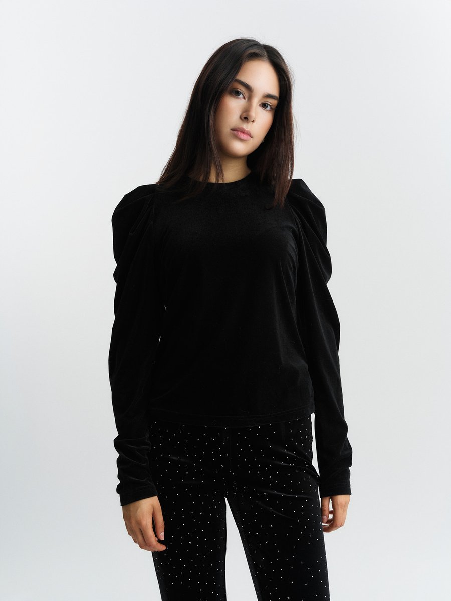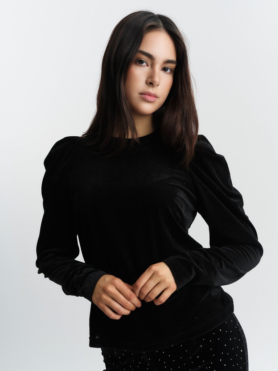 Crafted in soft and stretchy velour, it features long sleeves and a regular fit with subtle shoulder volume that adds a refined touch. Designed with a round neckline it’s a versatile style that can easily be dressed up or down for any occasion.
