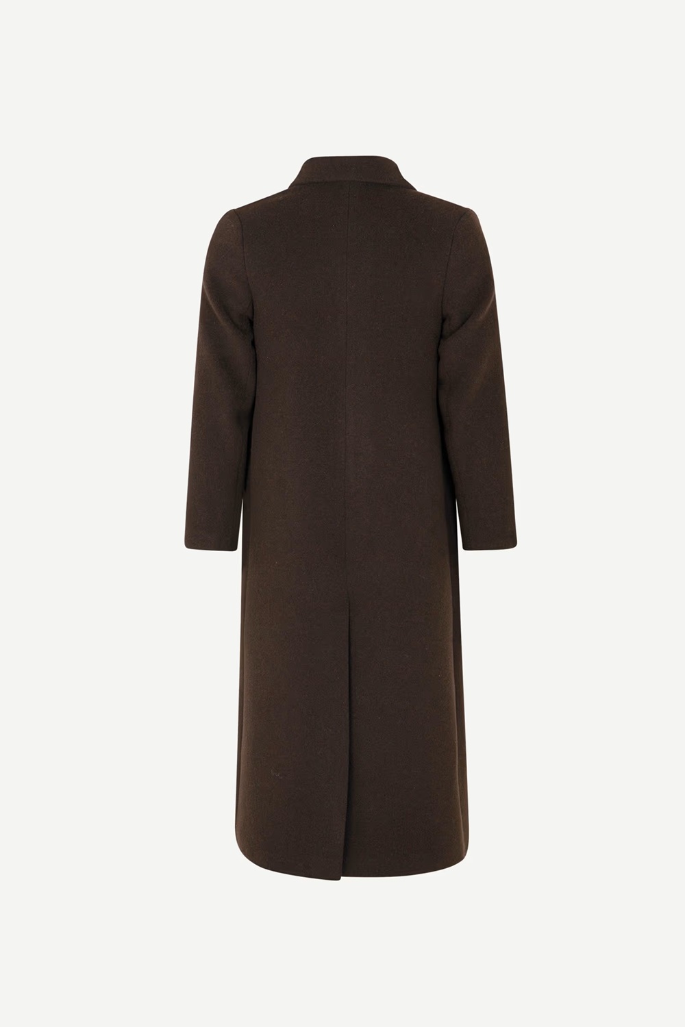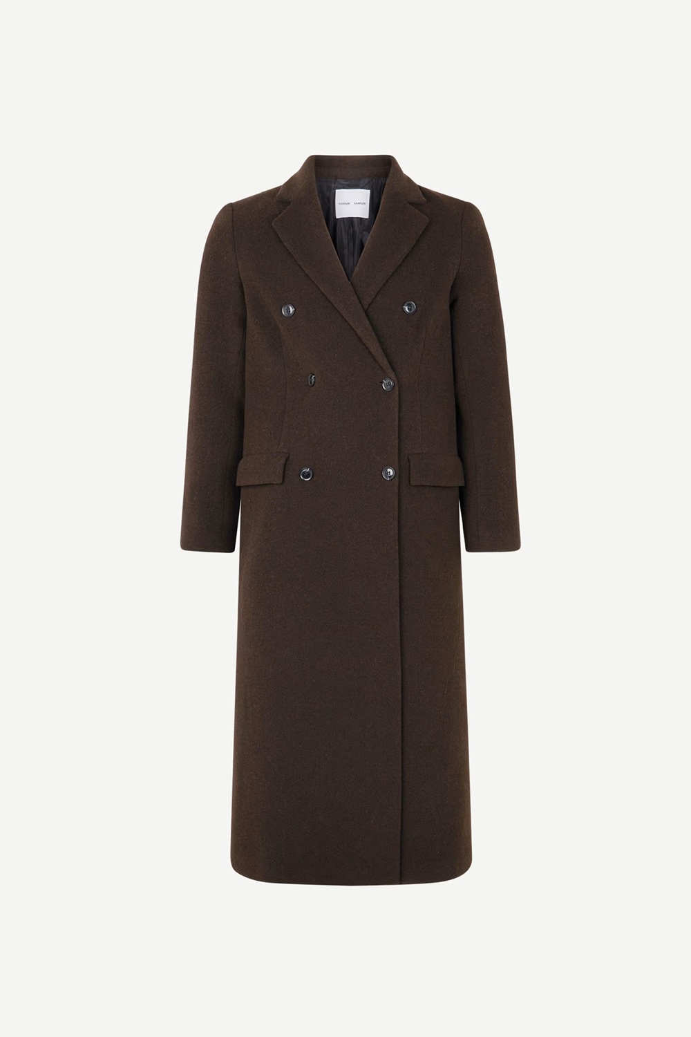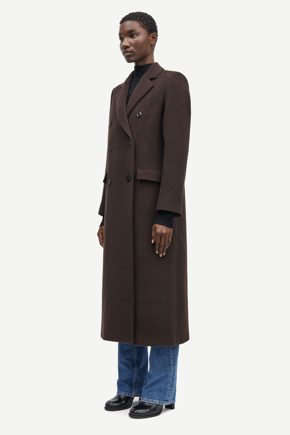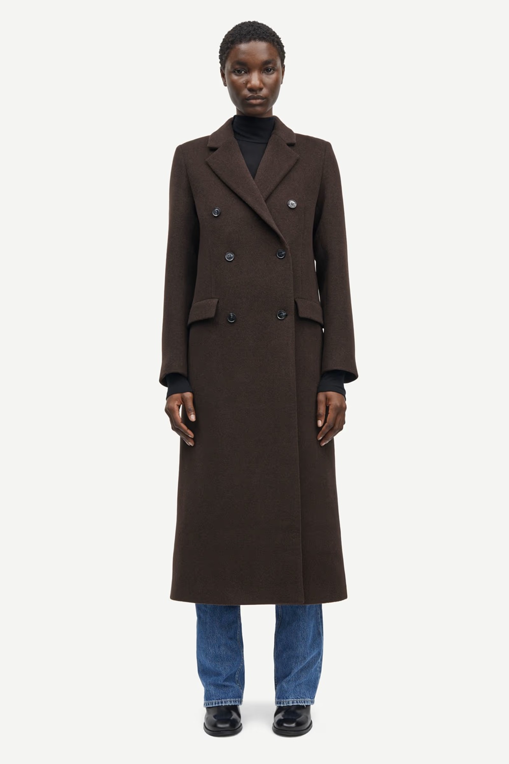 Long coat with a straight fit. Double-breasted button closure on the front.